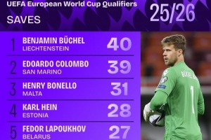 体育资讯11月20日讯 Squawka统计世欧预各队门将扑救次数,列支敦士登门将本杰明·布歇尔40次居首。