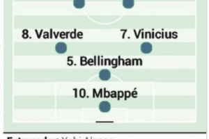 中场/边锋:居莱尔、卡马文加、巴尔韦德、维尼修斯、贝林厄姆